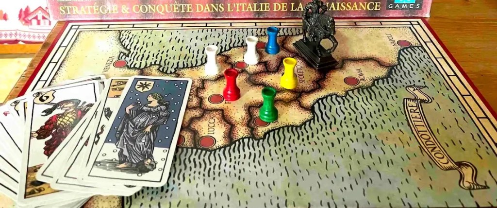 Une grosse boite pour un jeu de cartes au design très tarot pour une conquête acharnée de l’Italie de la renaissance.